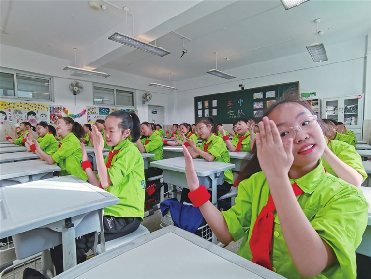 “祖国有我,未来有我……”在六年三班,塑料杯成为孩子们舞蹈的道具,伴随着《祖国有我》的旋律,大家手中的杯子翻飞,与课桌轻击,成为另类“伴奏”。孩子们双腿和脚也没闲着,踏步声应和着音乐节奏。身体在律动,音乐在飞扬,教室里昂扬着积极的力量。