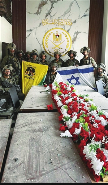 这张以色列媒体11月14日刊发的照片显示,以色列国防军士兵在加沙城巴勒斯坦伊斯兰抵抗运动(哈马斯)宪兵总部举着以色列国旗。新华社发