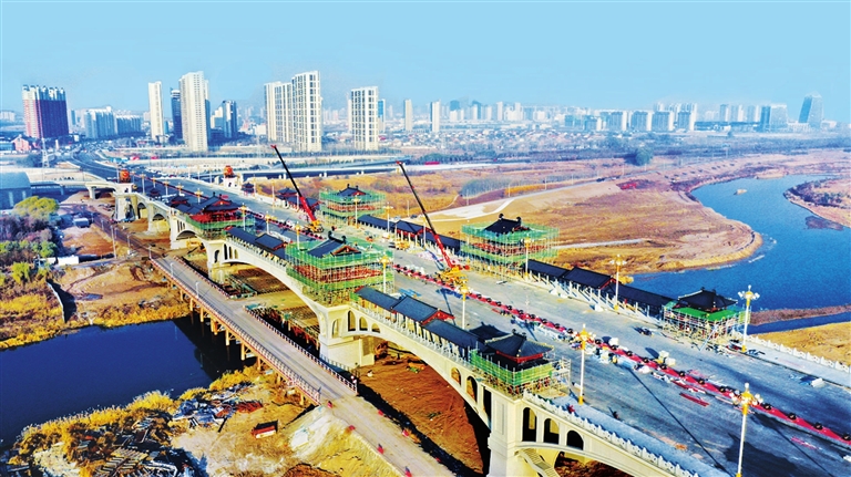 11月25日,清徐县汾河文源大桥桥梁区的古建筑安装建设在有序推进。大桥建成后,将提升城南交通的容纳力、承载力。