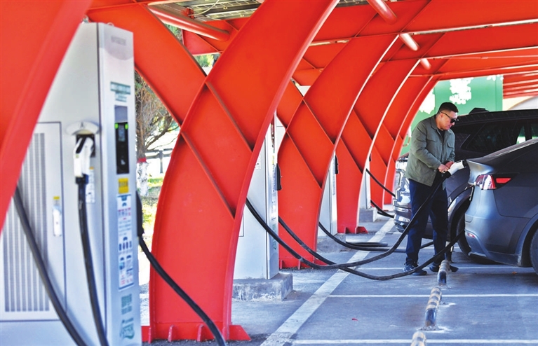 11月25日,驾驶员在大盂服务区给新能源汽车充电。目前,全省131对运营服务区充电桩已全部建成,实现全省高速公路运营服务区充电设施全覆盖,满足人民群众绿色出行需求。韩双喜 摄