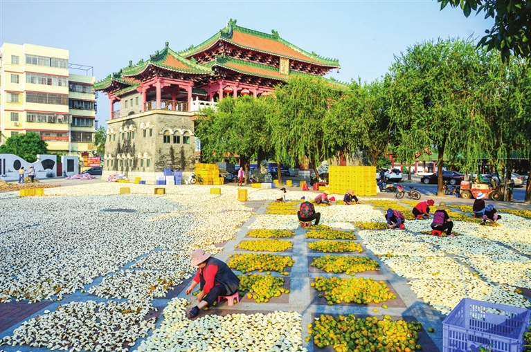 11月25日,在广东省江门市新会区一处空地,人们对新会柑皮进行翻皮晾晒。连日来,广东省江门市天气晴好,新会区果农把握有利时机,抓紧晾晒柑果果皮。新会柑经开皮、晒制、陈化等程序后可制成新会陈皮。新华社发(关煜柔 摄)