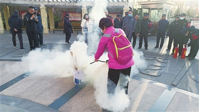 当天,消防培训老师向大家讲解了如何预防火灾,遇到火灾如何扑救以及自救逃生的方法,并手把手教授大家如何使用灭火器。同时,围绕小区消防安全管理人、单位员工的工作职责,对日常防火检查、灭火与应急疏散预案的制定、如何使用灭火设施、起火后的疏散逃生等内容进行了详细讲解。消防逃生灭火演练实操环节中,在老师指引下,大家弯腰低头拿着湿毛巾捂住口鼻,迅速撤离到安全区域。在模拟火灾现场时,居民们快速行动,采取正确的灭火措施,在规定时间内成功扑灭火灾。(周利芳、韩 蕾 文/摄)