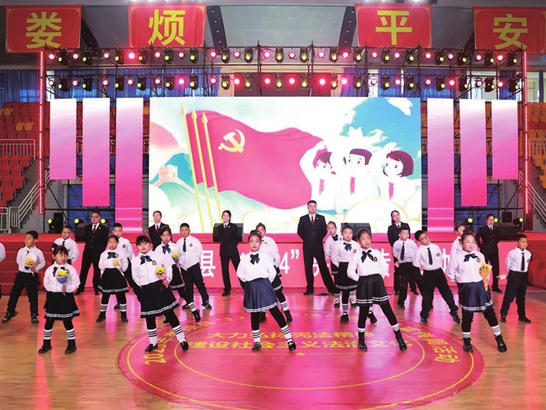 娄烦县检察院干警与娄烦县第二实验小学学生共同表演《宪法伴我成长》手势舞,坚定孩子们的宪法信仰,筑法治之基、积法治之势。