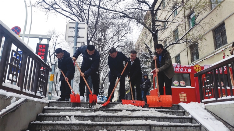 11日早上到岗后,员工们拿着铁锹、雪铲,扫积雪、铲冰层,对本部大楼、业务经营部内部区域及周边人行道进行清雪除冰,主动帮助附近的商铺清扫门前积雪,并对主干道南内环街平阳路口的人行地下通道口及台阶的积雪、结冰及时铲除,为来往行人、客户扫出了一条“平安路”,力保金融服务的畅通。周晨骁 文/图