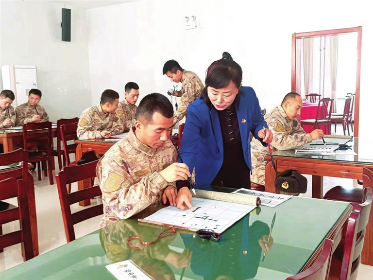 老师通过作品欣赏解读书法的文化与技巧,让官兵开阔了视野、陶冶了情操。最后还向战士们讲述了自身学习书法的经历和体会。