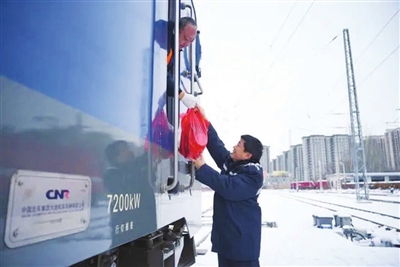 在太原火车站,工作人员将应急食品送到机车司机手中。(中国铁路太原局集团有限公司供图)