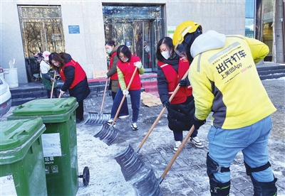 12月20日,学府街道中环社区联合新就业群体开展清雪除冰志愿服务活动。外卖小哥、社区志愿者忙碌的身影成为冬日一道亮丽的风景。李雅蓉 摄