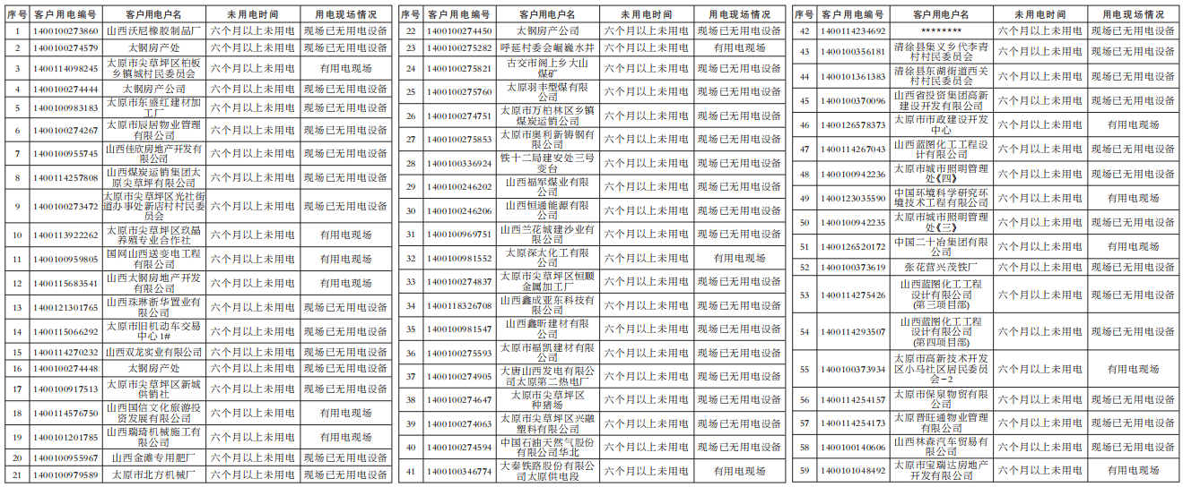 现将在我公司长期不用电且未办理相关手续的客户名单公告如下,请名单内的客户自公告之日起7日内与我公司联系办理相关业务,逾期未联系者,将按照《供电营业规则》第三十三条“用户连续六个月不用电,也不申请办理暂停用电手续者,供电企业须以销户终止其用电。用户需要再用电时,按新装用电办理”。联系电话:7381633 7381631