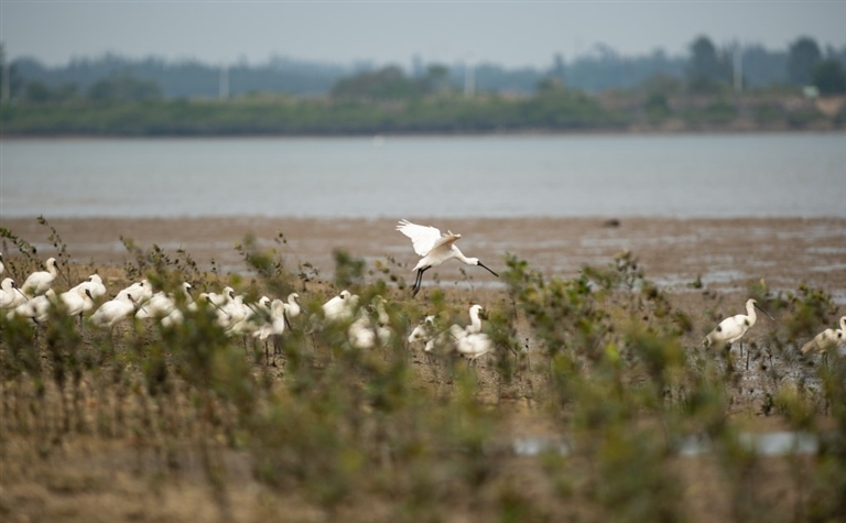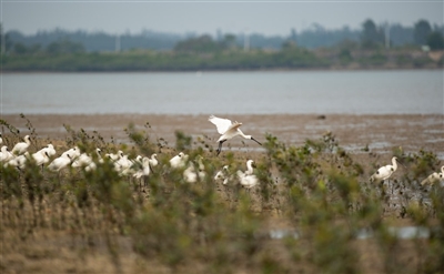 一群黑脸琵鹭在海南新盈红树林国家湿地公园的滩涂上休憩(12月27日摄)。近日,被誉为“鸟中大熊猫”的国家一级重点保护野生动物黑脸琵鹭飞抵位于海南省儋州市的海南新盈红树林国家湿地公园越冬。新华社发