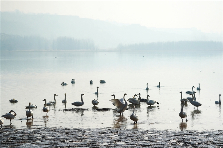 占地6000多公顷的山西平陆黄河湿地位于山西、河南两省交界处,这里气候温和、采食丰富,非常适宜白天鹅越冬。每年秋末冬初,白天鹅就会成群结队地从俄罗斯西伯利亚地区陆续飞临这里越冬。