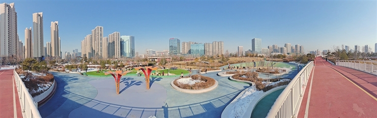 园子似乎并不大,一眼就望到了隔街的马路。园子也很安静,布景随着地形起起伏伏,观景层次丰富了不少。一路踏着朱红色的塑胶小道弯弯绕绕地走着,耳边竟萦绕出孩童嬉闹的声音。诧异之际,塑胶跑道被一座桥架了起来,桥下下沉式的儿童乐园,好不热闹。沿着这座小桥继续往东走,被蓝色的施工铁板挡住了,但是我能看到塑胶跑道一直延续着,横跨长治路,把已经建成开放的西区与正在修建中的东区,连接了起来。