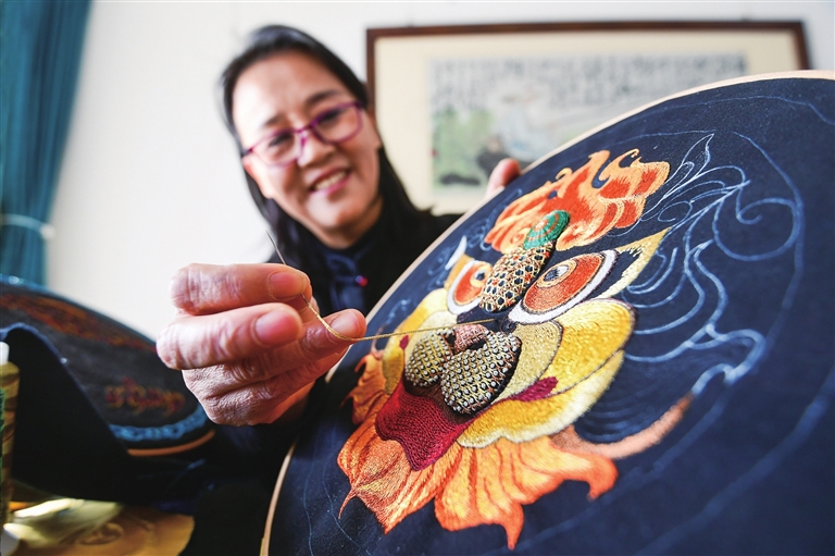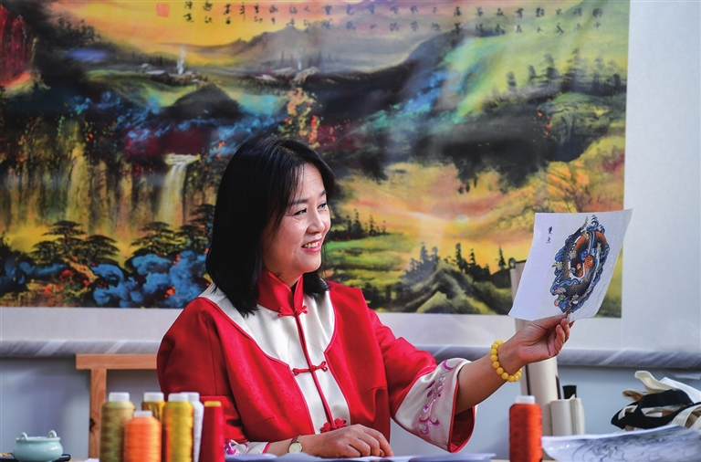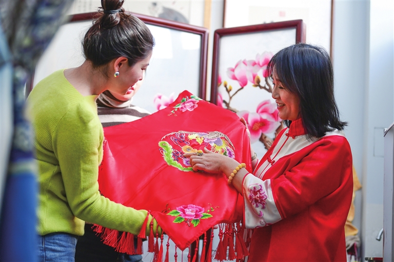 在省级非遗传承人王美萱的工作室,这种古朴之风扑面而来。五彩云肩色彩明艳、祥龙绣片栩栩如生、丝锦香囊素雅留香……随处可见的刺绣作品见证着王美萱50余年的华彩人生。