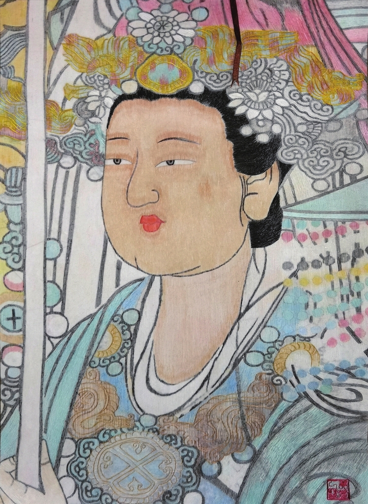 王美萱的刺绣善将平针、乱针、拉锁针融合,用色大胆,匠心独运的山西元素,使王美萱的刺绣作品散发着迷人的魅力。立体逼真的《云冈石窟大佛》,端庄细腻的《永乐宫侍女壁画》,英气威武的《关公》……都是王美萱的心头爱。