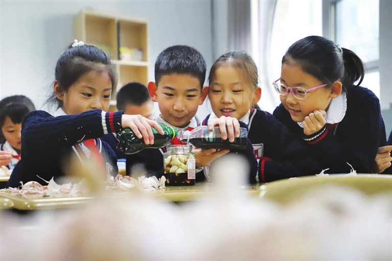 1月15日,迎泽区桃南小学开展腊八节主题实践活动。学生们一边学习制作腊八蒜,一边听老师讲解腊八节习俗,感受优秀传统文化魅力。张昊宇 摄