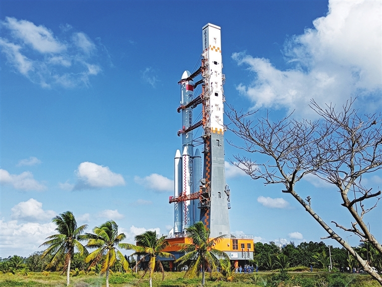 1月15日,天舟七号货运飞船与长征七号遥八运载火箭组合体在垂直转运中。