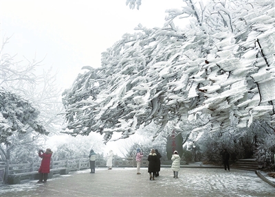1月19日,游人在江苏连云港市花果山玉女峰观赏雾凇美景(手机照片)。据中央气象台预报,20日至23日中国将迎来今年首场寒潮天气过程。新华社发(王 春 摄)