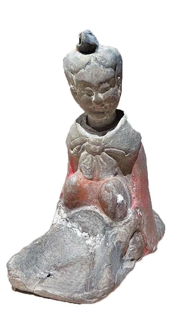 图一是一件彩绘陶持箕女仆俑,她生活在距今约1500年前的北齐时代。这件陶俑头梳单髻,身穿宽袖衣裙,外套白襦,白披肩在胸前打了个结。只见她双膝弯曲、蹲坐于地,双手握着簸箕边缘呈劳动状。岁月的打磨已经使我们看不清她的表情,不知她是面带微笑还是十分平静,或许她也无暇顾及这些心情,只记得院子里春天残落的花瓣、秋日里枯黄的落叶都要及时清扫,主人的日常起居要照顾得面面俱到,不知何时才能回乡看望亲人?