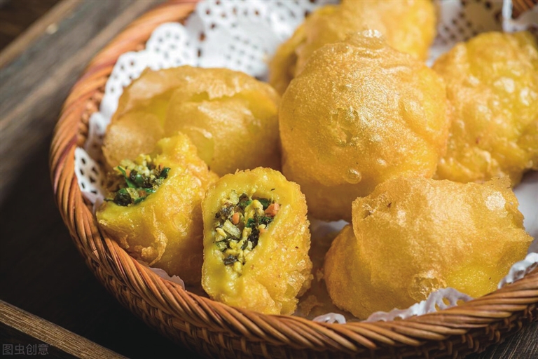 捏好的糕,要在笸箩里晾一个时辰再炸。母亲烧火,父亲炸糕。倒进大锅二三斤麻油,待油锅沸腾,父亲便往锅里放素糕。一圈一圈顶着出锅。油温必须控制好,火大了会炸焦,火小了会粘成一大片。边炸边码,把油糕立起来码在箅子上,一箅一箅的,晾一下午,然后一层一层地放进一口大瓮里,放在冻房或院子里冷冻。春节前,家家户户都要用麻油炸出许多金黄鲜亮的油糕,以备正月里随时食用。