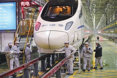 为提高运力保障春运,中国铁路太原局集团有限公司太原车辆段新接收10组动车组,日增加运力最高可达数万人。图为1月25日工作人员对新接收的动车组进行重点整修。王韵菲 摄