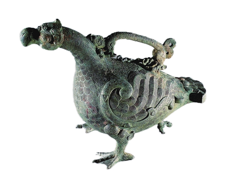 赵卿鸟尊是一件融多种鸟类形象为一体的青铜器,其整体造型似一只引颈挺立的鸷鸟,而将其分割成若干部分看,可发现其喙似鸮,其头似鹰,其身似鹅,其足似鸭。屈原在《楚辞·离骚》中写道:“鸷鸟之不群兮,自前世而固然。”鸷鸟作为一种猛禽,凶猛而不成双,暗合了赵简子贵为晋国上卿,雄踞晋阳这一史实。鸟尊背有器盖,盖上有虎形提梁。虎后腿处有铰链与盖上的环钮相连。鸟颈与中空的腹腔相通,锋锐的喙成为自动开合的流口,当倾斜鸟身往外倒酒时会自动开启;平置后口即闭合,既可防尘、也能防虫,十分巧妙。加上鸟背上的提梁,使用起来非常方便。为保持尊身盛酒后重心的平衡,鸟尾之下做了虎形支足,可谓匠心独具。