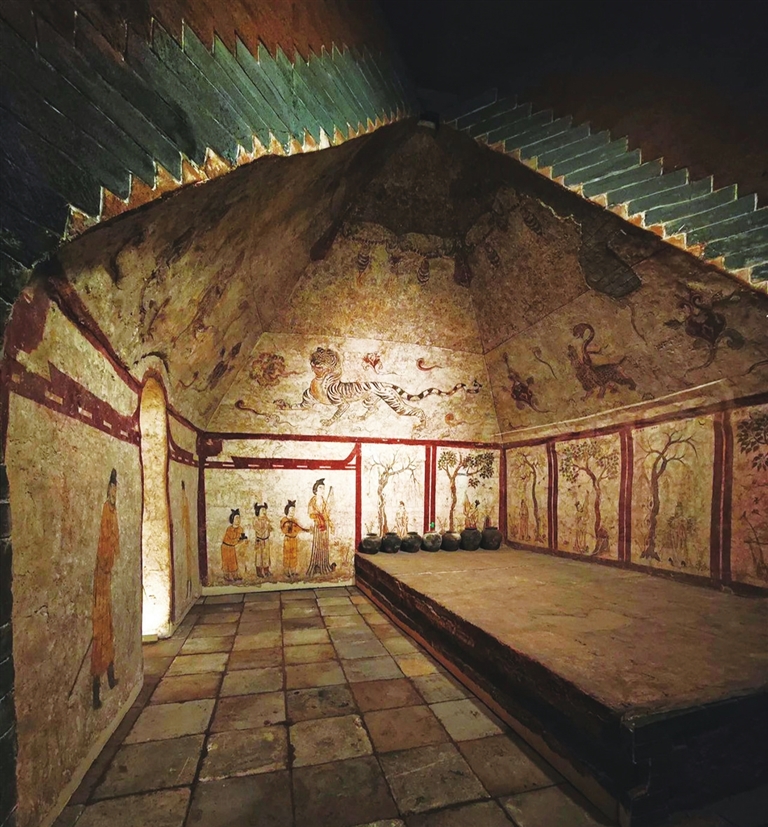 唐代壁画墓——郭行墓是在该馆首次与公众见面。该墓是2019年8月在万柏林区小井峪小学建筑工地的一次施工中被发现的。墓主人郭行,曾追随唐太宗李世民征讨辽东,因其身经百战,勇冠三军,被授予上骑都尉。