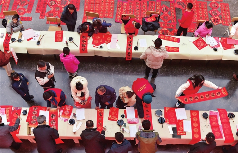 1月28日上午,太原美术馆(太原画院),众多书画名家齐聚一堂,现场挥毫,为市民送上百余副春联、“福”字,迎接龙年春节的到来。王 昕 摄