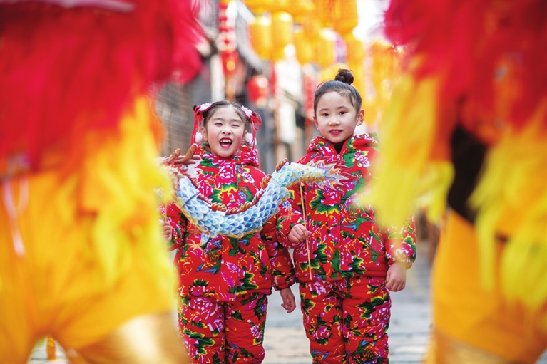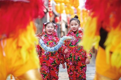 二月八日,在江苏省兴化市昭阳街道八字桥文旅休闲街区,小朋友在观看舞狮表演。春节将至,各地举办丰富多彩的民俗展演活动,热热闹闹迎新春。新华社发 (周社根 摄)