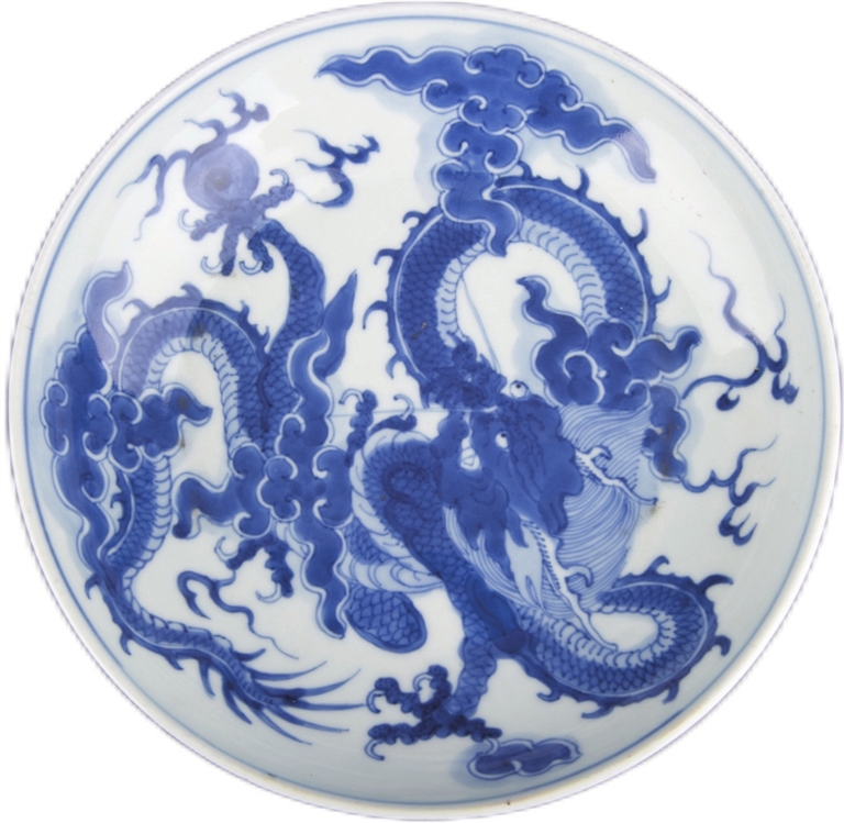 龙戏珠也是瓷器装饰上典型的龙纹,样式为宝珠在中间,左右二龙相对戏游,称为双龙戏珠纹、二龙戏珠纹。两条云龙、一颗火珠,《通雅》中有“龙珠在颌”的说法,认为龙珠是一种宝珠,可避水火。除二龙戏珠外,还有群龙戏珠,都有吉祥安泰之意。五代越窑青釉龙纹四系壶,腹部浮雕双龙戏珠及卷云纹,是目前所见最早的龙戏珠纹饰。龙戏珠纹饰在明代青花、五彩瓷器上多见,色釉瓷器上偶见。