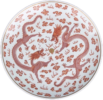 太原市博物馆收藏的清光绪款红釉二龙戏珠纹盘,高7.4厘米,口径51厘米,足径34.5厘米。盘敞口,弧壁,浅腹,圈足。盘内饰矾红彩双龙戏珠纹,外壁绘两条赶珠龙纹。底书红彩“大清光绪年制”六字双行楷书款。光绪时期瓷器上的龙纹有的躯干无背鳍,有的背鳍呈短柱状,有的为猴头作直立行走状,有的细颈粗躯、腿壮胫瘦,与清代早期龙纹形象相比,整个龙纹面貌苍老、体性纤细、爪软无力。