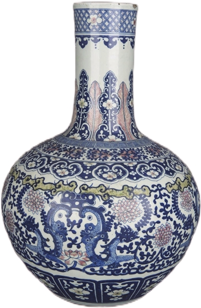 太原市博物馆收藏的清代青花加紫夔龙纹天球瓶,高55.3厘米,口径12.3厘米,足径20.4厘米,器物高大造型端庄,瓶直口,长颈,球腹,圈足。内施白釉,外壁以青花、釉里红绘夔龙纹饰。青花加紫俗称青花釉里红,其特点既有青花的幽靓雅致、沉静安定,又增添了釉里红的浑厚壮丽,丰富了色彩效果,形成了高雅而又朴实的艺术风格。因此,青花釉里红瓷成为我国珍贵的瓷器种类之一。