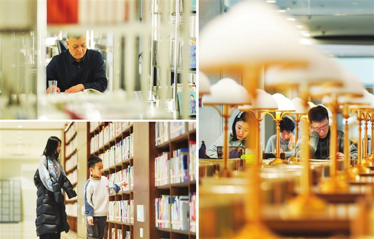 2月11日,农历正月初二,不少市民在阅读中度过春节假期。左上为新华南宫书店内;左下为太原市图书馆内;右为山西省图书馆内。王韵菲 摄