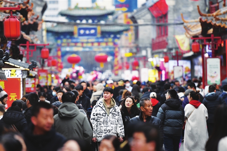 春节期间,柳巷、钟楼街、食品街等地颇受青睐,游人如织。图为2月14日食品街景象。邓寅明 摄
