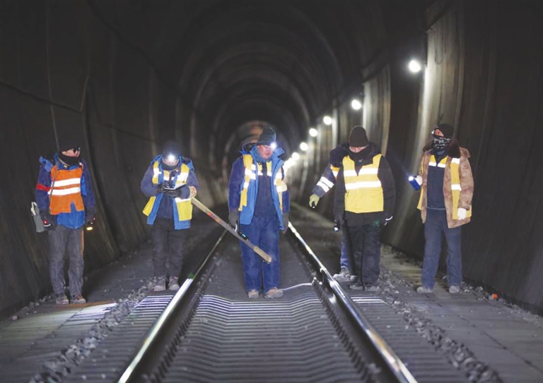 “路基变化、气候波动……这些因素都是研究冻土影响的关键数据,一丝一毫的变化都会导致线路出现不同的问题。”工人们来到作业地点开始上道作业,张福强掏出一本快被翻烂的笔记本,一边记下这次养护的气候及线路数据,一边和工友们向隧道深处走去。