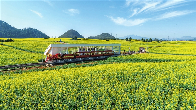 近期,云南省曲靖市罗平县近百万亩油菜花相继绽放,花海与山峦、村寨勾勒出一幅田园春景图,吸引不少游客前来赏花踏青。新华社记者 胡 超 摄