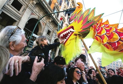 2月18日,在意大利罗马,一名小朋友在彩妆巡游上观看舞龙。2月17日至18日,意大利罗马举行彩妆巡游、舞龙表演、书法体验等欢度春节的活动,吸引众多市民、游客前来体验中国文化,共同庆祝龙年春节。