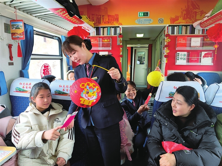 2月24日,太原客运段4621次“蔡家崖”号红色文化列车上,送祝福、赏花灯、猜灯谜等活动让旅客感受到浓厚的节日氛围。杨 娜 摄