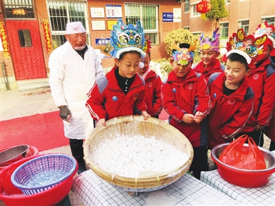 元宵代表着团圆、幸福。学生们学着大人的样子滚元宵,蘸水、撒面、滚动,寓意新学期学业圆圆满满。随后的舞龙环节更是把开学典礼推向了高潮,象征着学生们以龙腾虎跃的精气神迎接新学期。