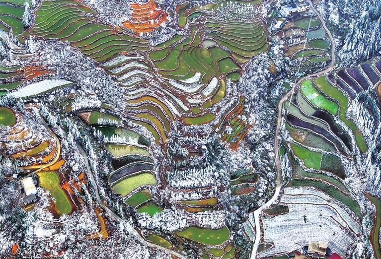 这是桂林市全州县蕉江瑶族乡大源村的雪景(无人机照片,2月28日摄)。连日来,受强冷空气影响,广西桂林市全州县蕉江瑶族乡持续冰雪天气,瑶寨梯田被冰雪覆盖,美如画卷。新华社记者 黄孝邦 摄