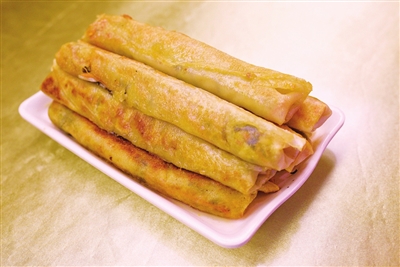 卷卷卷是一道技术活儿。面皮平放在案板上,将馅均匀摊满整张饼皮,然后用灵巧的双手顺势转动,同时将两端的口子封紧,以不露馅儿为准,一条粗粗短短的或细细长的卷子就形成了,然后摞在盘子里,形状似金字塔。