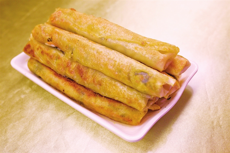 煎卷卷是最后一道工序。烤热的鏊子均匀刷上一层油,然后把一条条卷卷放在鏊子里,用筷子不停地转动,待到两面金黄,就可出鏊盛盘了。