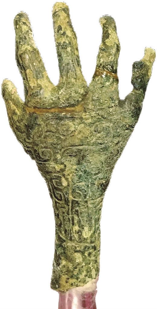 这只青铜右手,发现的位置在墓主人的左小腿处,墓主人的右手臂骨骼并没有留下来。至于手的用途,因为没有文字留下来,其作用只能靠推测。