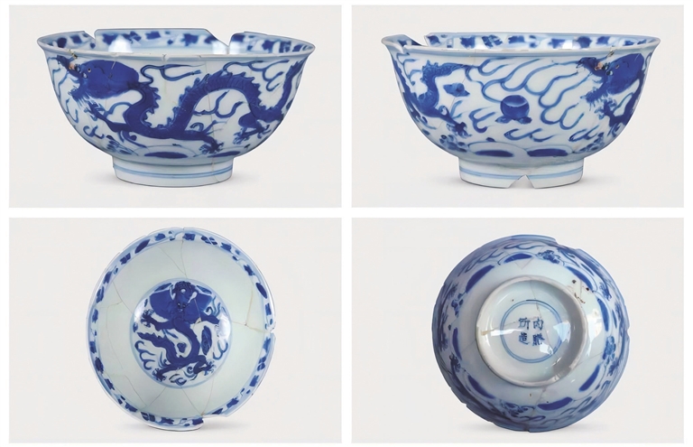 在这批瓷器中,最著名的是晋王府的青花“内膳所造”龙纹碗。碗状基本完整,尖唇,外侈,弧腹,圈足,挖足较深,足墙内外齐平,外墙竖直,内墙内弧,足沿圆滚。白胎,坚致,细腻。釉色微青,平整光洁。外壁周身绘有两条穿云戏珠龙纹,侧身,头朝左,尾向右,昂首,带角,束发后扬,张口,翘舌,怒目圆睁,作咆哮状,细脖,屈身,轮状五爪,齿形鳞片,有腿毛,周身满布带状云纹。内壁近口沿处绘一周缠枝花卉纹,内底绘正面龙纹,形象同鹿纹花口杯。外底双蓝圆圈内书青花“内膳所造”四字双行楷书款,字体有力,较为规整,整个碗口径12.8厘米,足径5.5厘米,高6.3厘米。