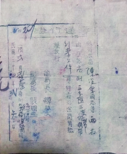 本局陈俊厚同志等两名由王家庄到三分区三支队公干携带行李文件等件,希沿途岗哨验证放行。(限贰月贰拾叁日作废,向本三分局缴收注销)