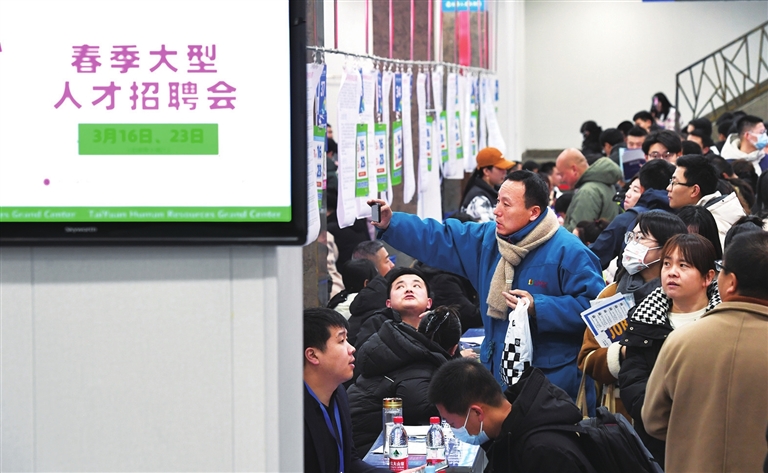 3月2日,为期两天的万岗促就业大型招聘会在太原人才大市场举行。首日110余家用人单位参会,提供各类就业岗位4000多个,吸引了5000余名应聘者到场。牛利敏 摄