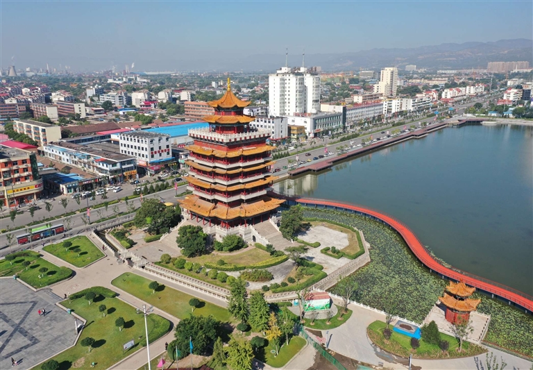 这座塔名叫水阁楼,由水塔集团出资,在明代古塔的原址上复建。新的水阁楼以龟形底座托起宝塔式楼阁,外形酷似黄鹤楼,楼高九层,雕梁画栋,气势磅礴。水阁楼一旁建了醋都广场,周边很快形成了清徐县城最繁华的商业区。自此,以东湖、蓝天为背景的水阁楼图景进入人们的视野,成为新清徐最初的logo。它的典雅大气、恢宏壮观与清徐“醋都”的美名相得益彰,齐放光彩。