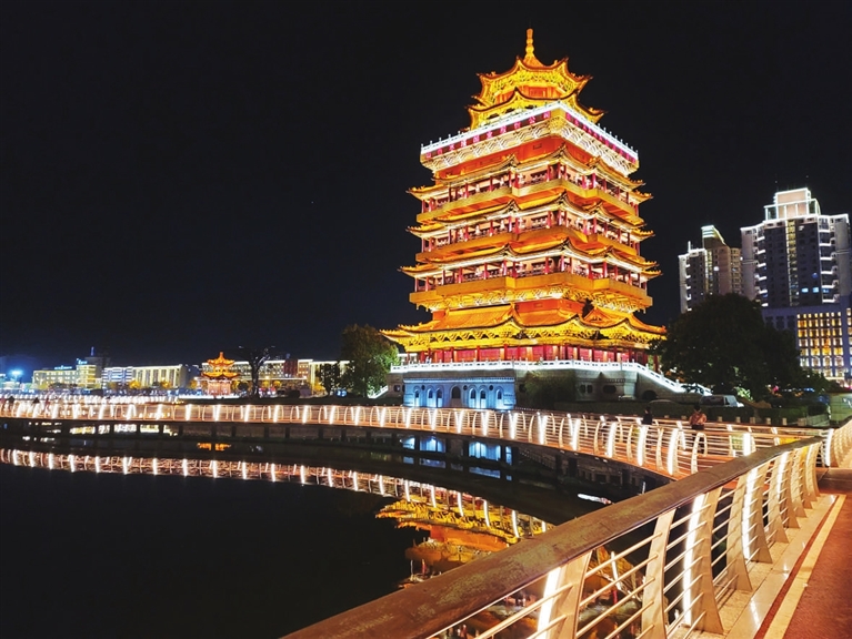 我最喜欢的,是东湖的璀璨之夜。当晚风轻拂水面,摇碎一湖灯影,全世界都在湖水的怀抱中安静下来,如襁褓里熟睡的婴孩,感受着母亲温柔的拍打。夜晚的水阁楼是一座金碧辉煌的灯塔,开车回家的人远远望见它,就像望见了温暖的家,望见了自己的母亲。古老的玉皇阁在迷蒙的灯影中显得更加古朴,更加慈祥而深不可测。想我当年远眺玉皇阁默许心愿仿佛就在昨天。昔时的玉皇阁尚是水中孤阁,而今有廊桥栈道直通玉皇阁,人们可以近距离瞻仰这座古庙,近距离祈福。数不清的长长的灯带绕着湖,绕着桥,绕着人的脚步。工作了一天的人们,沿着湖走一走,跑两圈,将一天的疲累和苦恼都尽数倒入东湖中,好不惬意。