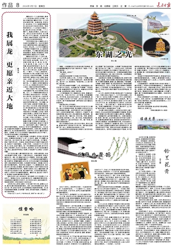 北方龙舟比赛少,雕龙画凤的地方多。我常去颐和园,在有龙凤图案的文物前,思考一个朝代的远去。长城和黄河,常被比喻成长龙,一静一动,颇能代表北方人的精神。站在长城上遥望,感觉到古人正是在龙图腾的激励下,一代代构筑起坚强的精神长城;在黄河边,那裹挟着黄土的长龙,似乎在讲述着中华民族蜿蜒曲折、奔流到海的历史故事。在祖国的东西南北,龙图腾,成为华夏子孙的精神寄托。更多时间,我喜欢一个人静静地思考,龙形象之所以成为国人的最爱,是与其外在接天入地的气势和内在奋斗不止的精神密切相关的。做虎不如做龙,龙之力量和唯美,颇符合君子在天地间行大道、做大事的气质。对龙的仰望和亲近,说明了人性的升华与锤炼的重要性。属相为龙,是生辰八字的巧合,更是催人奋进的潜在暗力的推动。