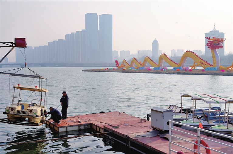 气温回升,春意渐浓,为确保游客安全,三月七日,汾河景区工作人员对游船进行检修、维护。韩双喜 张澍宏 摄
