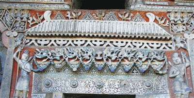 值得一提的是,在云冈石窟第9窟前室东壁上层,雕刻出了一开间仿木构形象,清晰可见歇山屋顶、屋檐、人字支臂叉手等细节。同样,在沁源的北魏王凤石窟正壁上,也雕刻出了一开间高浮雕、透雕门楼,屋顶、屋檐、斗拱、阑额、门柱、柱础等构件一应俱全。而在不远处的贾郭石窟最东侧一窟内正壁中,同样雕刻出了一开间门楼,其屋顶、屋檐、斗拱、阑额、门柱等构件同样清晰可见,其时代为唐代。