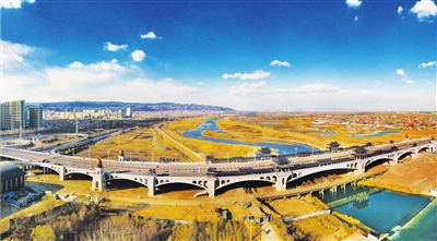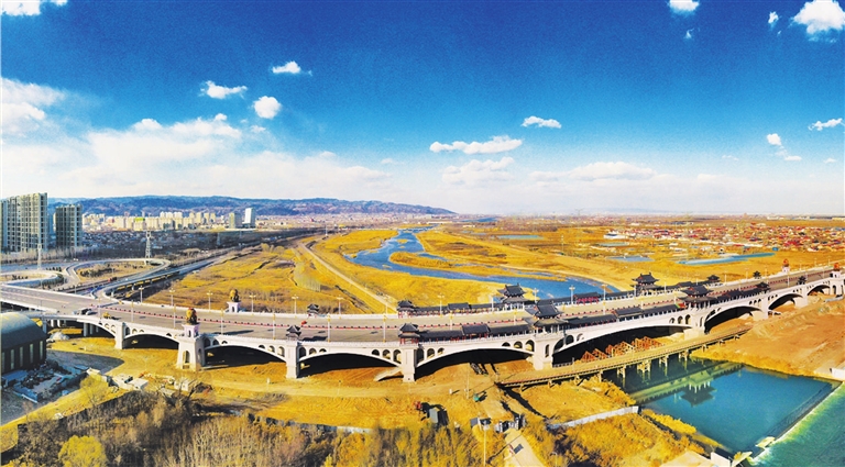 3月9日,建设中的醋都大桥桥面仿古建筑古香古色。醋都大桥全长1532米,总体布局呈拱形,平面采用船形布置。大桥设有九孔连波、观景台、迎客厅等八处景观,实现现代技术与古典艺术、汾河景观与地方文化的有机融合。米国伟 摄